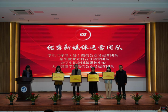 会议在宣传工作视频中拉开序幕,校长助理李洁宣读了《烟台理工学院关于表彰2021—2022年度宣传工作先进集体和先进个人的决定》,决定授予发展规划处等6个单位为年度宣传工作先进集体,学生工作部(处)微信公众号运营团队等4个团队为优秀新媒体运营团队,张雅芝等8名同志为优秀宣传员,崔景友等3名同志为优秀舆情联络员,曲建财等3名同志为优秀网评员。会上,校领导依次为获奖单位、个人及学校短视频大赛获奖代表颁奖。