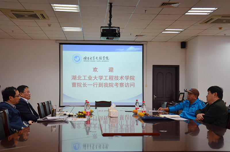 于光辉院长代表我院向曹院长一行的到来表示热烈欢迎,他从学院发展历程、师资力量、学科建设等方面介绍了我院基本情况。李相然书记就我院“和合文化”“博文约礼,经世致用”的育人理念以及“双师课程”教学模式等方面作了介绍。曹刚院长对我院的热情接待表示感谢,并介绍了湖北工业大学工程技术学院的办学特色、教学模式、管理模式等情况。双方就学科建设、人才培养、科技创新、人事管理和考核制度等方面进行了交流探讨。