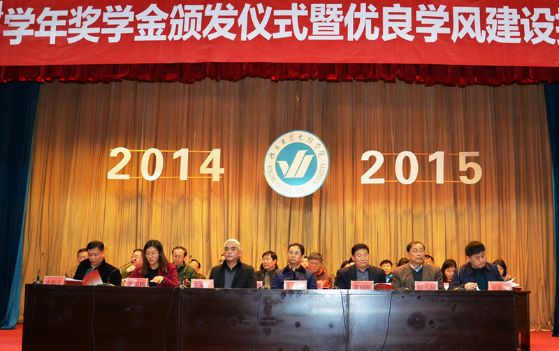表彰先进扬学风,争优创先树新篇。12月3日下午,烟台大学文经学院2014-2015学年奖学金颁发仪式暨优良学风建设推进大会在多功能厅召开。院领导于光辉、李相然、王来武、刘孔庆、李荣梅、辛连军、尤敬法及各系部主任、党支部书记出席大会并在主席台就座。李荣梅副书记主持大会。全院辅导员、班主任及获奖学生代表参加,共同见证了这一光荣时刻。