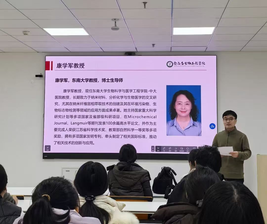 12月4日下午,食品与生物工程学院于综合楼S209学术报告厅成功举办学术报告会。食品与生物工程学院特别邀请到东南大学生物科学与医学工程学院教授、博士生导师康学军教授为学院师生作“靶向肠道菌群代谢物分析及健康评估应用”主题报告。报告会由食品与生物工程学院副院长王跃猛主持,学院部分教师及学生代表参加。